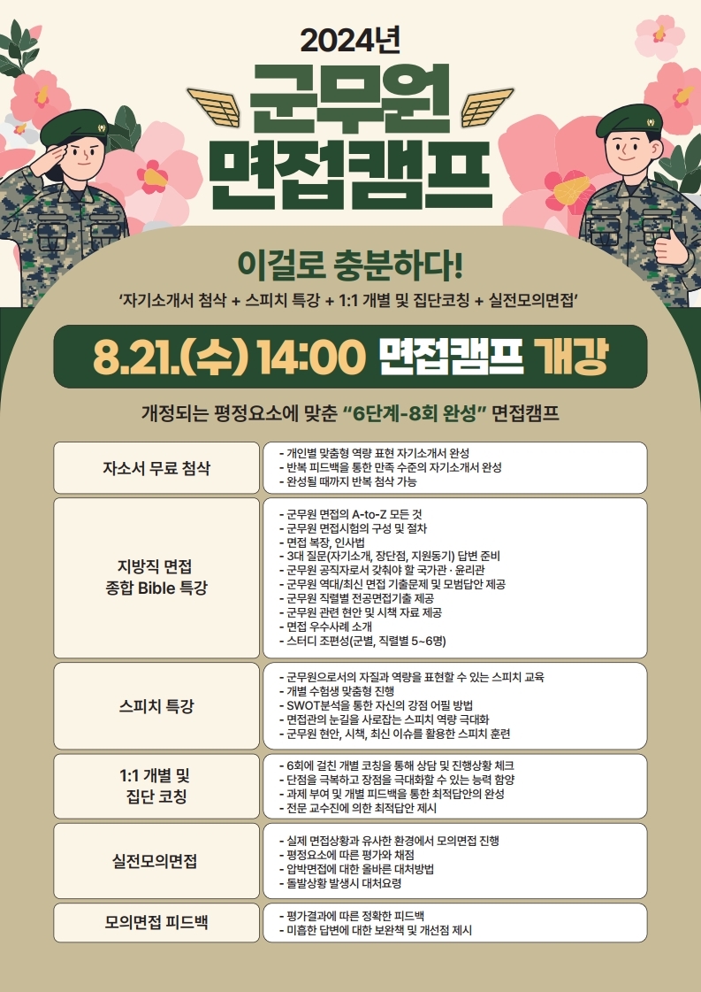 [육군] 23년 군무원 최종합격! 밀착관리 군무원 면접캠프 8/21(월)개강!