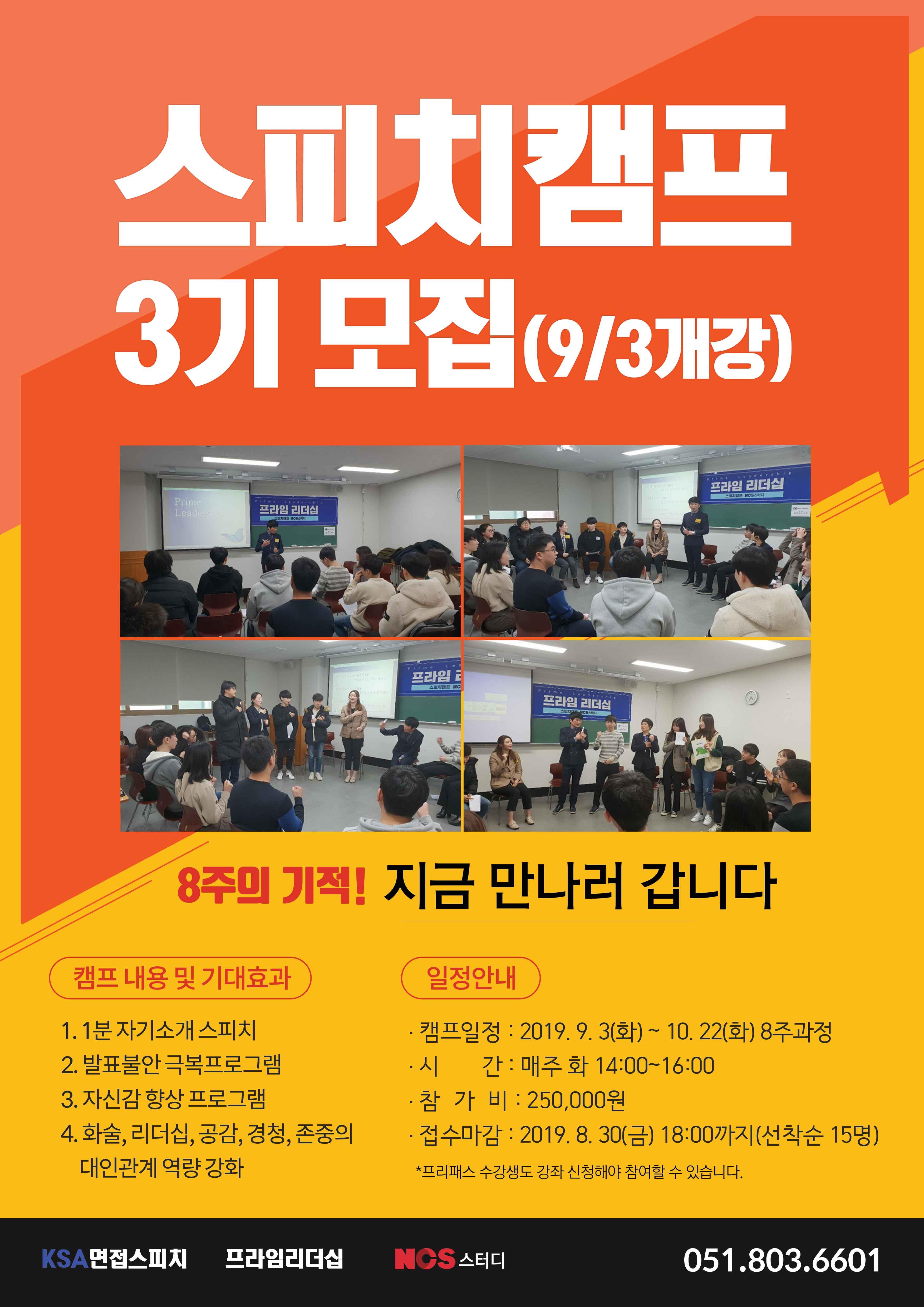 스피치캠프 3기 모집(9월3일 개강) 개강일 : 2019-09-03 No.21| 조회 : 176접수완료
