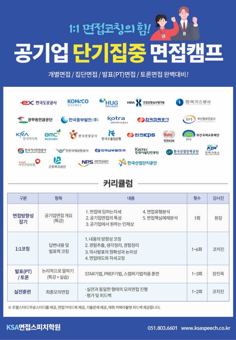 공기업 단기집중 면접캠프 수시모집(국민건강보험공단,심평원,한국가스안전공사 등) 개강일 : 2019-05-29 No.9| 조회 : 937접수완료
