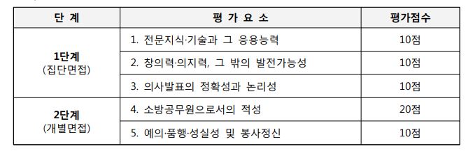 안녕하세요. KSA면접스피치학원입니다. 이번 2019년 경상남도 소방공무원 면접대비반이 시작됩니다!! 이번 면접은 1단계 집단면접(토론면접) / 2단계 개별면접으로 구분되어 실시할 예정입니다. 1단계(집단면접)와 2단계(개별면접)의 평가 점수를 합산하여 평균점수가 50%이상인 경우에 합격이 되고, 과반수가 40%미만의 점수를 평정항 경우에는 불합격이 되니, 그에 맞춰서 확실히 준비하는 것이 좋겠죠? 구체적인 평가요소는 아래와 같습니다.