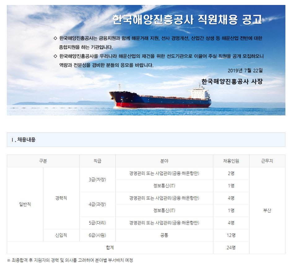 안녕하세요. KSA 면접스피치학원입니다. 이번 한국해양진흥공사에서는 총24명의 인원을 뽑고있습니다.