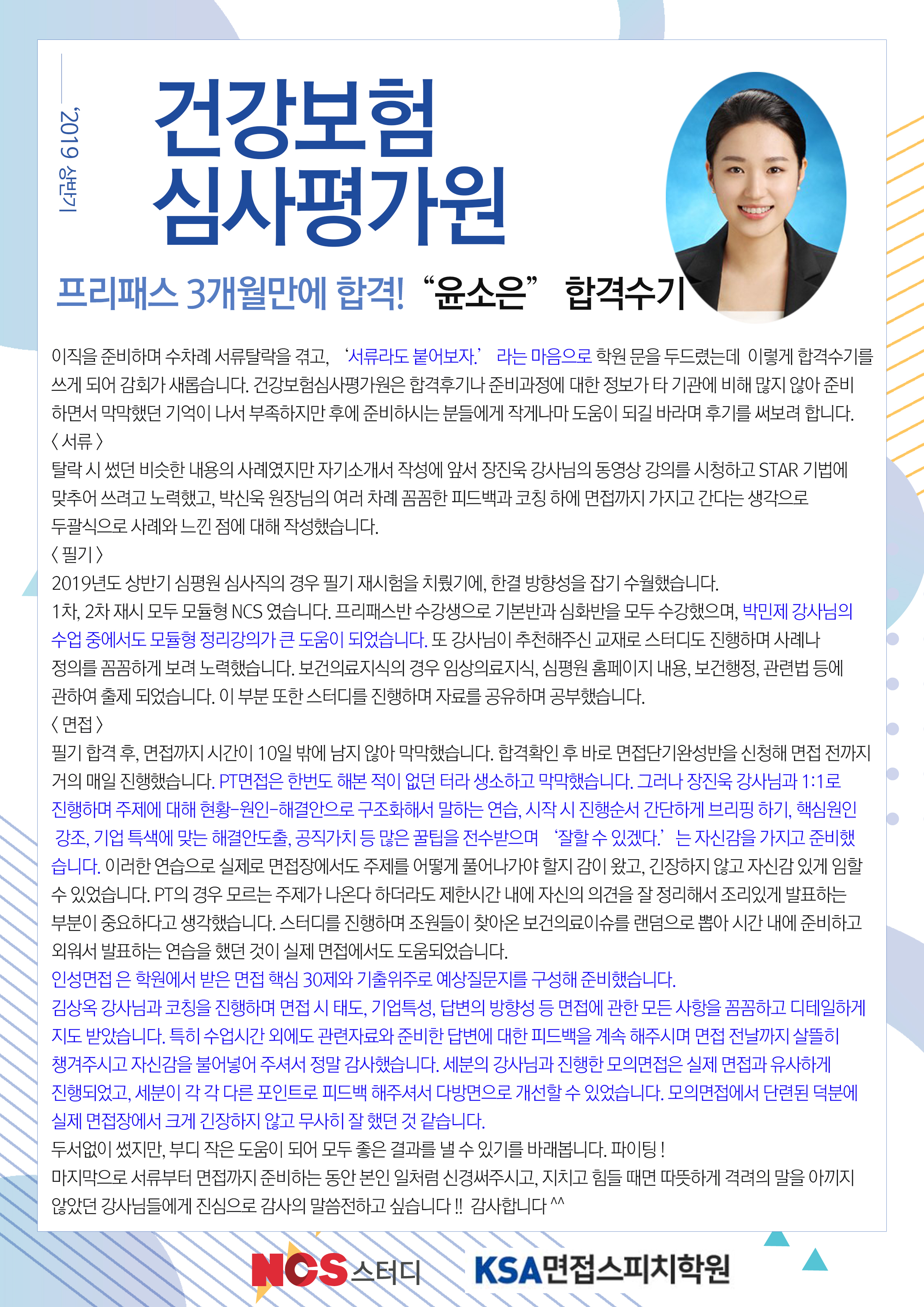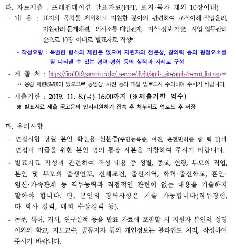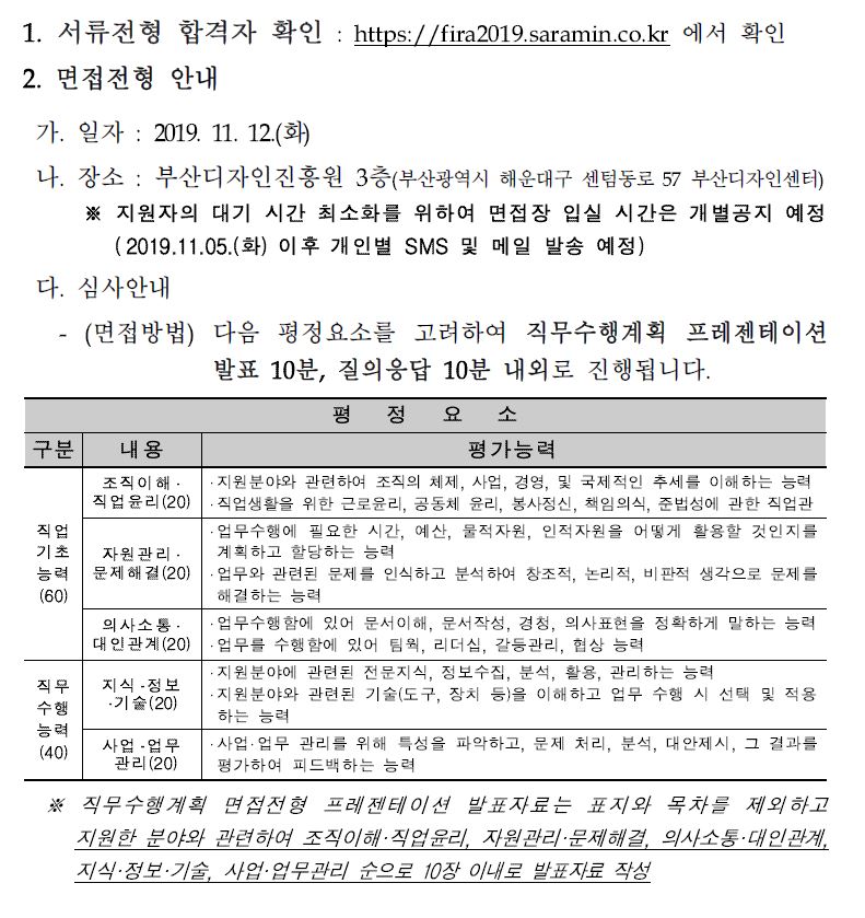 안녕하세요. KSA면접스피치학원입니다. 한국수자원공단 실무직근로자 서류전형 합격자공고가 11/1 금요일에 떴습니다. 면접전형은 11월 12일 화요일이며 면접유형은, 직무수행계획 프레젠테이션 발표 10분, 질의응답 10분 내외로 진행됩니다. 프레젠테이션 PPT 발표자료는 표지,목차를 제외하여 10장이내이며 실제면접에서 지원한 분야와 관련하여 조직이해/직업윤리, 자원관리/문제해결, 의사소통/대인관계, 지식/정보/기술, 사업/업무관리 순으로 작성하여야 합니다. PPT 발표자료 준비하는 과정을 저희 KSA면접스터디학원에서 코칭시간에 1:1 맞춤형으로 디테일하게 알려드리며, 최종 발표자료가 완성되면 실전 모의면접을 통해 실전감각을 기르고 피드백을 받으신 후 실제 면접에 임하 실 수 있습니다. 수강료는 1:1 맞춤형 코칭으로, 기본 4~6회 (회당 10만원)으로 역량에 맞춰서 일정을 잡으실 수 있습니다.