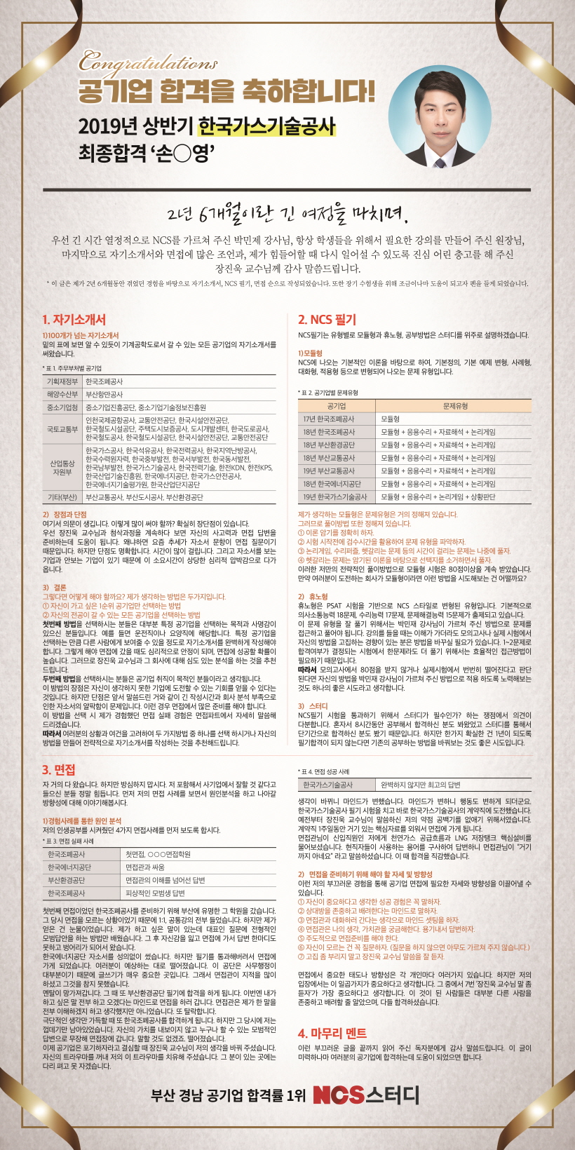 <한국가스안전공사 오청택 합격수기> 작년 고등학교 3학년때 부터 NCS필기 준비를 했습니다. 학교에서 꾸준히 해도 1년동안 필기 한번 합격이 안되었습니다. 하지만 꾸준히 포기하지 않고 노력하니 안되는 것은 없다고 생각합니다. 고졸로써, 다른 군필자들과 경쟁하려니 스펙 등이 많이 떨어졌습니다. 저의 합격 노하우를 말씀드리고자 합니다. -서류 한국가스안전공사는 서류에서 30명을 뽑습니다. 한국사는 필수이며 가스기능사도 필수로 취득하면 많은 도움이 됩니다. 작녀부터 자소서를 많이 써왔기 때문에 쉽게 썻던것 같습니다. 거짓없이 진솔하게 자신의 이야기를 작성하면 합격 할 수 있다고 생각합니다. -필기 필기는 정말 노력이 필요하다고 생각합니다. 안공공사의 필기에 합격하기 까지작년부터 10개 이상의 기업에 필기를 보았습니다. 많은 문제를 풀어보고 틀리면 틀린문제를 1분안에 풀 수 있또록 열심히 풀었습니다. '나 같은 사람이 필기에 붙을 수 있을까' 라는 생각을 많이 했습니다. 계속 도전하다보면 언젠가는 합격이 될 수 있다고 생각합니다. -1차면접 면접은 한마디로 정의하면 자신감 이라고 생각합니다. 1차가 전공면접이라서 가스 관련으로 공부했습니다. 하지만 실제면접에서는 '베르누이가 누구냐', '이상기체가 뭐냐'등을 물어 보았습니다. 전공은 하나도 대답을 못했습니다. 하지만 큰목소리로 면접관의 눈을 보면서 진솔성 있는 답을 한다면 실수를 하더라도 꼭 합격할 수 있다고 생각합니다. -2차면접 2차면접은 토론 면접과 인성면접 입니다. 토론과 인성 면접은 KSA면접스피치학원이 정말 도움이 되었습니다. 장진욱 강사님과의 1:1 면접 코칭을 시작ㅇ으로 실무 위주의 면접 강의를 듣고 실제 면접에서도 강사님 코칭 그대로 면접이 나와서 정말 학원 다니기 잘했구나 하고 생각했습니다. 이러한 도움들 덕분에 합격이라는 결과를 가져왔다고 생각합니다. 마지막으로 하고 싶은 말은 타인보다 스펙이 떨어진다고 실망하지 말고 노력을 하는 것이 정말 중요합니다. 지금까지 저의 취업 후기 읽어주셔서 감사합니다. 한국가스기술공사 손*영 최종합격을 축하합니다 + 합격수기