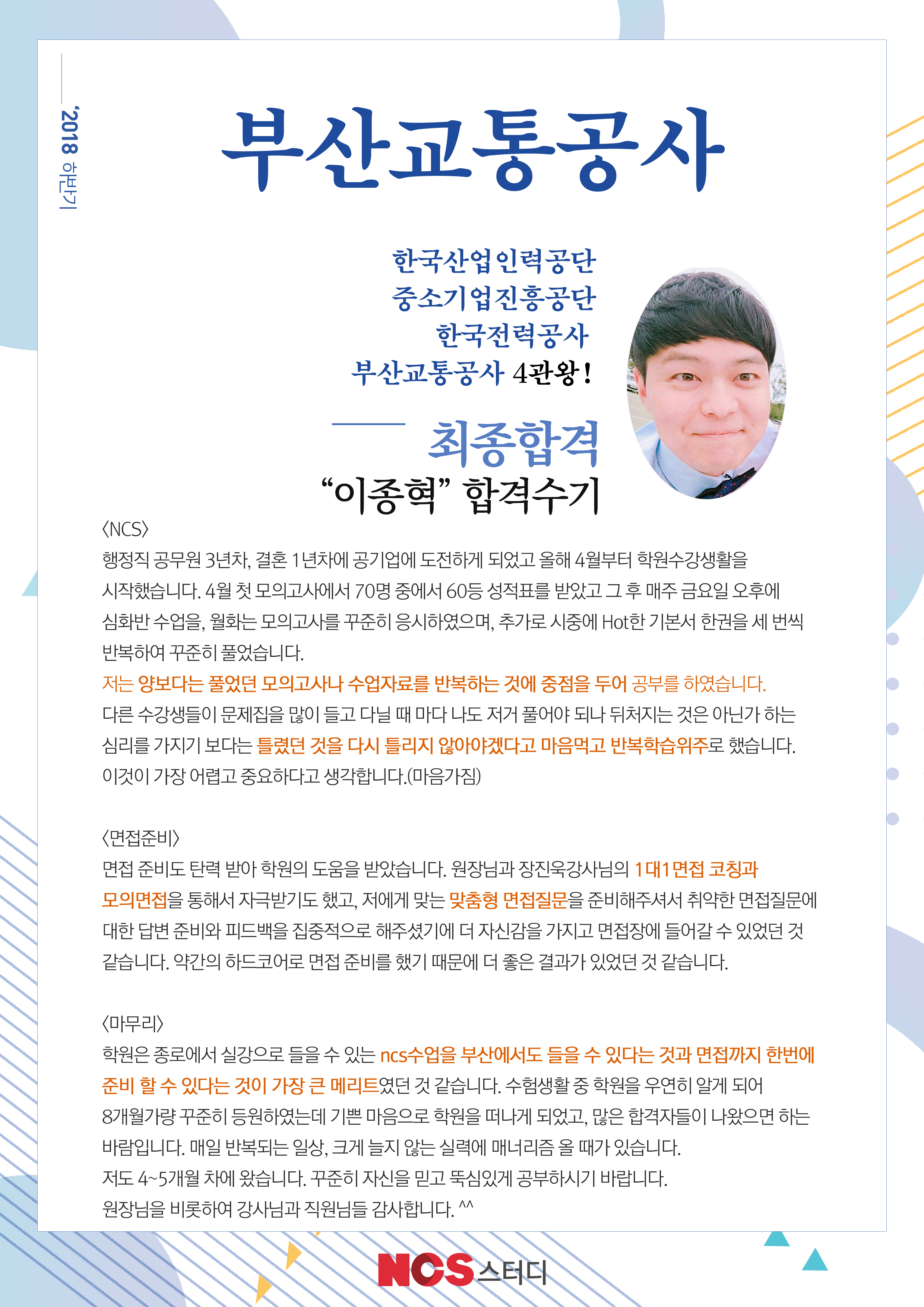 기본코칭 1회차: 공기업 면접에 대한 기본방향과 부산교통공사 면접에 대비해 무엇을 준비할 것인지의 방향성을 잡는 특강 형태로 진행합니다. 기본코칭 2회차: 조직적합도+직무적합도 중심의 1:1코칭으로 진행합니다. 내용의 방향성, 소재적합도, 발표력, 이미지 등 전반적인 코칭이 이루어집니다. 기본코칭3회차: 지원자의 인성 즉 경험과 생각을 정리하고 설득력있는 답변을 만들어 갑니다. 그 외 1분자기소개, 지원동기, 마지막 할 말 등에 대해서도 지원자에 맞게 컨설팅해 드립니다. 최종 모의면접: 실전과 동일하게 공기업 직원으로서의 정신자세와 직무전문성, 논리적 발표력, 태도, 임기응변 등 최종 점검 및 코칭이 이루어집니다. 2018년 하반기 부산교통공사 100% 합격의 노하우 그대로 최선을 다 하겠습니다. 우리는 1:1코칭의 힘을 믿습니다. ![]()