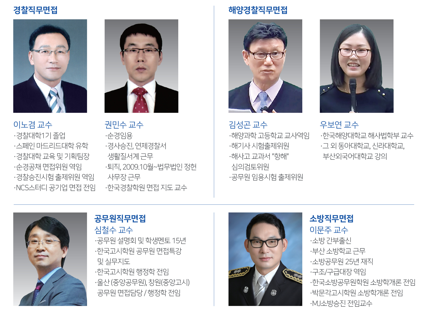 공무원 면접에 필수적으로 체크해야 할 인성, 공직관, 전문성 등 업무추진 역량과 직무수행에 필요한 지식, 능력 등 적격성 코칭을 집중적으로 준비합니다. (의무직은 직무수행계획서 작성도 케어합니다.) 면접 코칭 횟수 조정 가능(2회~6회/회당 10만원) 공무원 면접 10년 노하우 코치진이 함께 합니다.