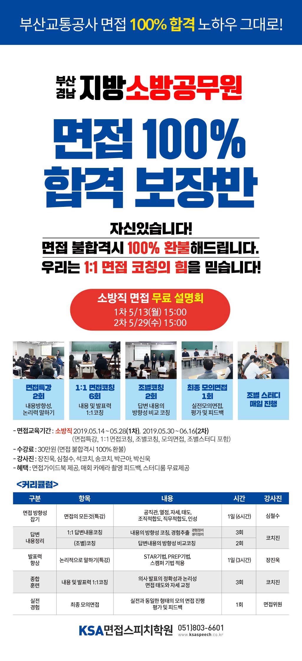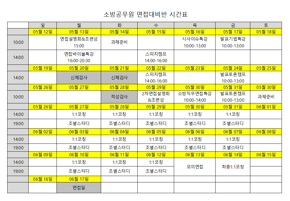 면접 100% 합격 보장반 으로 여러분의 최종합격을 책임집니다. 면접 불합격시 100% 환불해 드립니다. 소방공무원 면접은 1차와 2차에 나눠 진행합니다. 4월25일(목) 필기 합격자 발표 후 5월8일부터 10일까지 체력시험이 진행됩니다. 따라서 5월13일(월) 15시에 소방 면접 무료설명회를 진행하며 14일부터 면접반이 개설됩니다. 하지만 적성시험이 5월28일(화)로 잡혀있는 관계로 5월29일(수)에 2차 면접 설명회를 진행하며 5월30일(목)부터 면접반에 참여하셔도 됩니다. 즉, 소방공무원 면접은 체력시험 후 바로 참여할 수 있으며, 적성시험이 끝난 후 부터 참여하실 수도 있습니다. 비용은 동일합니다.