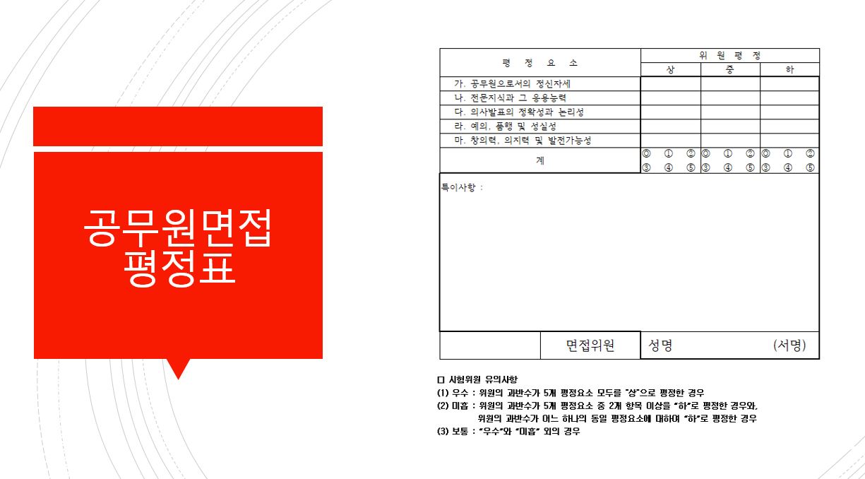 공무원 면접을 보게되면 이 평정표에 따라 우수, 보통, 미흡으로 나뉘어집니다. 면접위원의 과반수가 미흡이 되면 필기점수와 상관없이 탈락하게 되므로, 평정요소가 하나에 치우치지않도록 고루고루 신경써서 준비해야합니다.