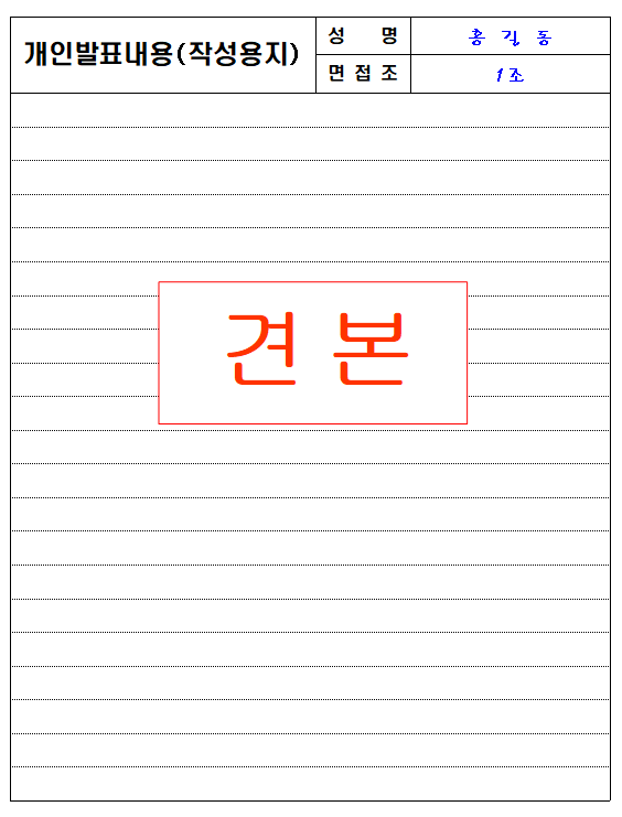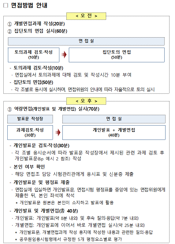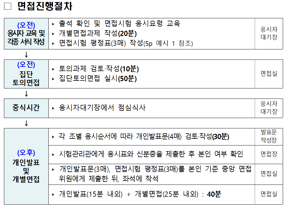 ‣ 역량면접 실시 : 12:00~17:50 - 개인발표문(PT) 작성(3부, 총 30분)->면접장으로 이동 - 면접장 앞에서 응시표와 신분증 확인 후 대기 - 호각소리가 울리면 각자의 면접장에 입장 - 면접시험평정표와 개인발표문(PT) 면접관에 제출 -> 인사 후 착석 - 면접관의 지시에 따라 개별면접 진행 (PT 발표시간 8분이내 -> PT 추가질문 -> 인성에 관한 질문, 총 25분, 종료 5분전 노크로 신호) 5. 면접시험 종료 - 개별면접이 종료되면 면접관에 인사 후 퇴장 - 설문작성장으로 이동 -> 설문지 작성 - 휴대포 등 전자기기 반환 - 귀가