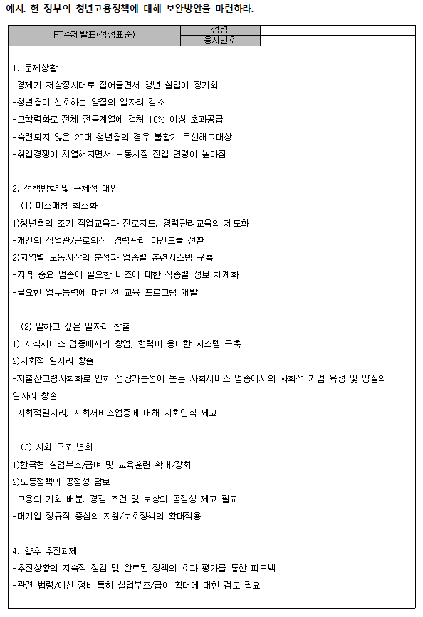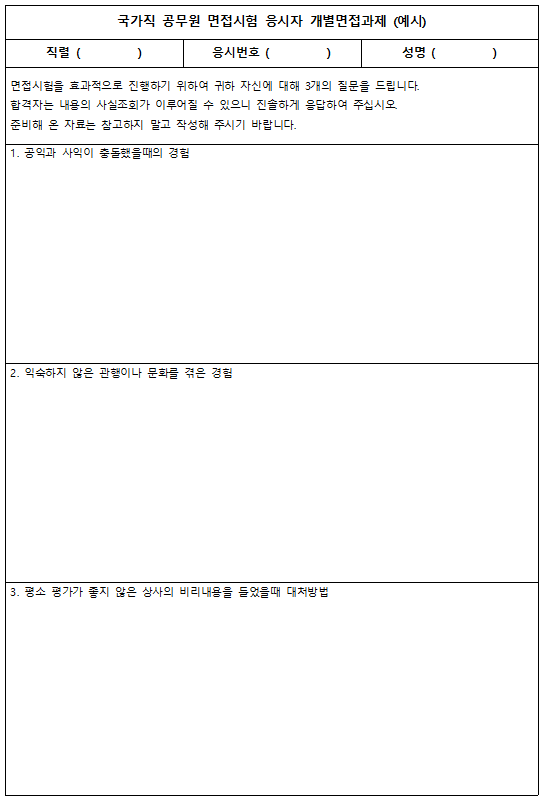 [국가직 7급 면접에서 작성하는 개별면접과제] 자기소개서가 없는 공무원 면접전형에서는 면접당일 개별면접과제를 작성합니다. 사전조사서, 자기기술서 등 여러 명칭으로 불리우고 있지만, 다 똑같은 의미입니다. 면접 당일, 현장에서 자필로 작성하게 되는 자기소개서라고 생각하면 되겠습니다. 자기기술서에 제시되는 질문내용은 직렬에 따라, 그리고 매년 달라집니다. 그러나 지원자들에게 요구하는 내용은 일정범위 안에 있습니다. 예를 들면, 목표달성을 위해서 최선을 다한 사례, 위기와 고난을 극복한 사례, 희생 봉사행동으로 감동을 준 사례 또는 창의적인 방법으로 성취, 성공한 사례나 소신과 사명감을 가지고 선행한 사례 등을 주로 물어보며 국가직 7급 면접의 경우, 7급 주사보에 맞는 다양한 상황제시형 제시문이 출제됩니다. 어려운 것이 바로 이 상황제시형 주제문이죠.
