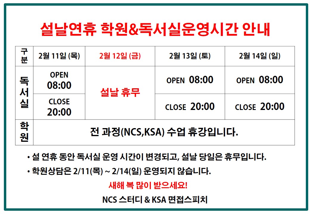 [공지] 설날 연휴 학원 일정 및 독서실 이용안내